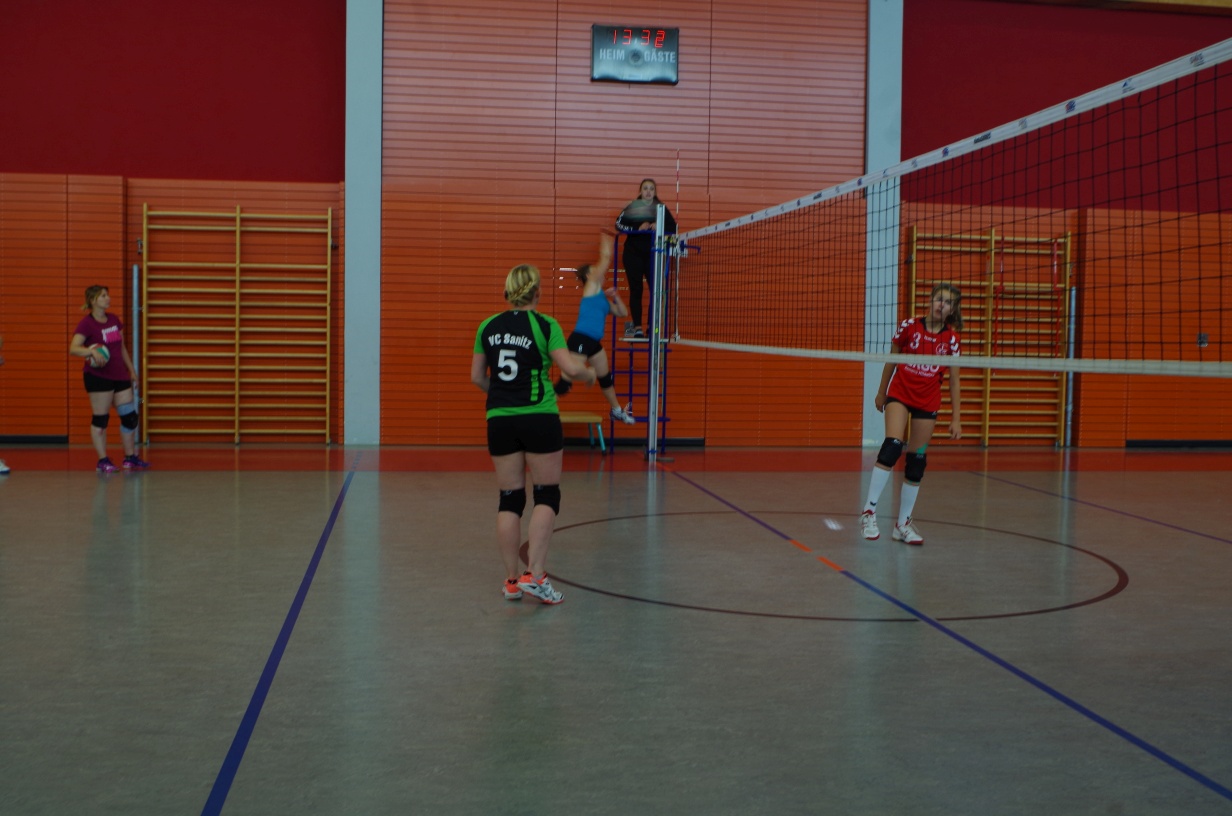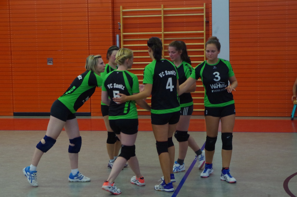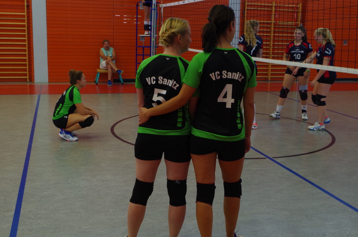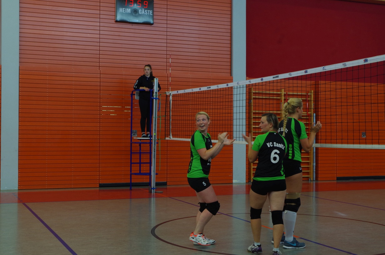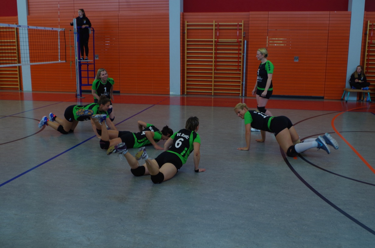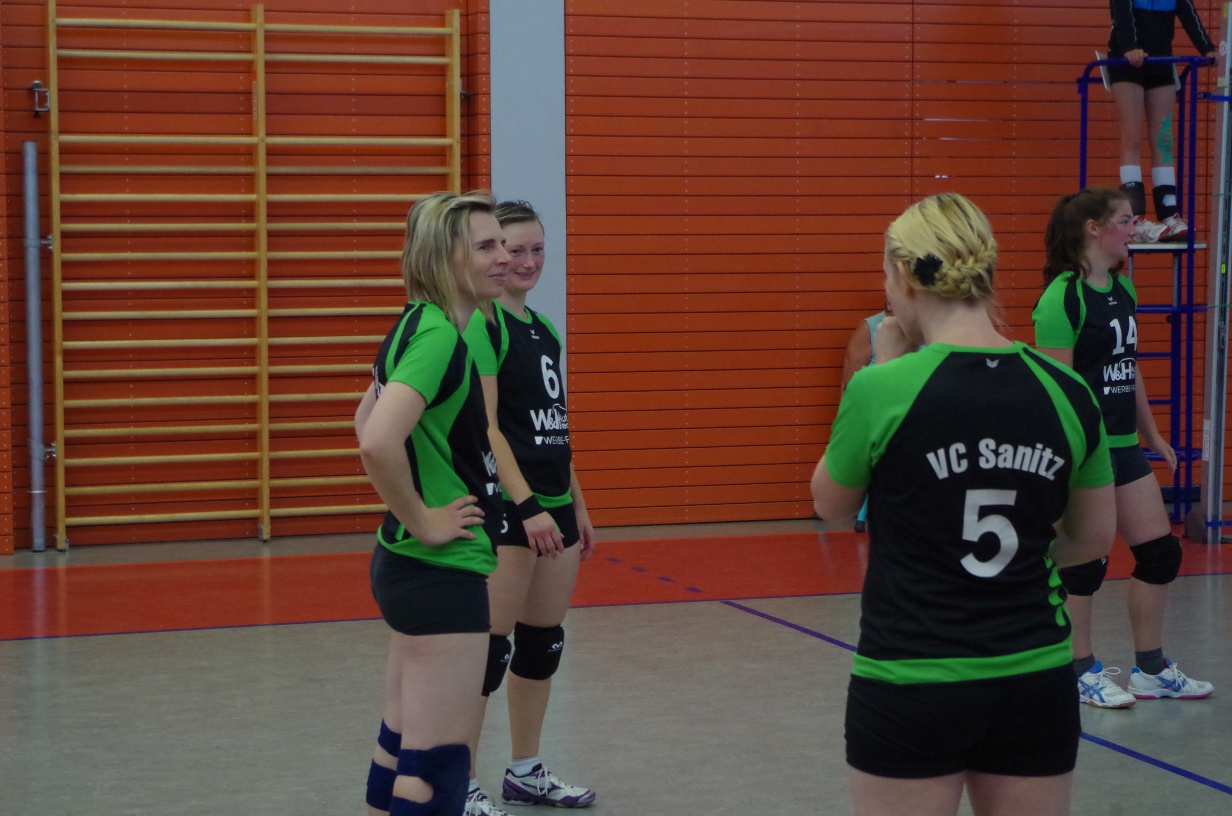 Wir waren erstaunt, wie flink sie waren. Dagegen sahen wir so manches Mal ganz schön alt aus (im wahrsten Sinne des Wortes, denn wir sind überwiegend doppelt so alt). Doch wollten wir zumindest mit unseren bereits gewonnenen Erfahrungen punkten und gewannen die ersten beiden Sätze mit 25:13, bzw. 25:14. Allerdings wären wir nicht der VC Sanitz, wenn nicht nach einem Hoch ein Tief folgen würde. Zum Ende des dritten Satzes wollten die Annahmen nicht mehr klappen und die Stralsunder Mädels kamen mit ihren Punkten immer näher. Zum Glück konnten wir eine Niederlage gerade so abwenden und verabschiedeten die Gastgeber mit einem 25:22.