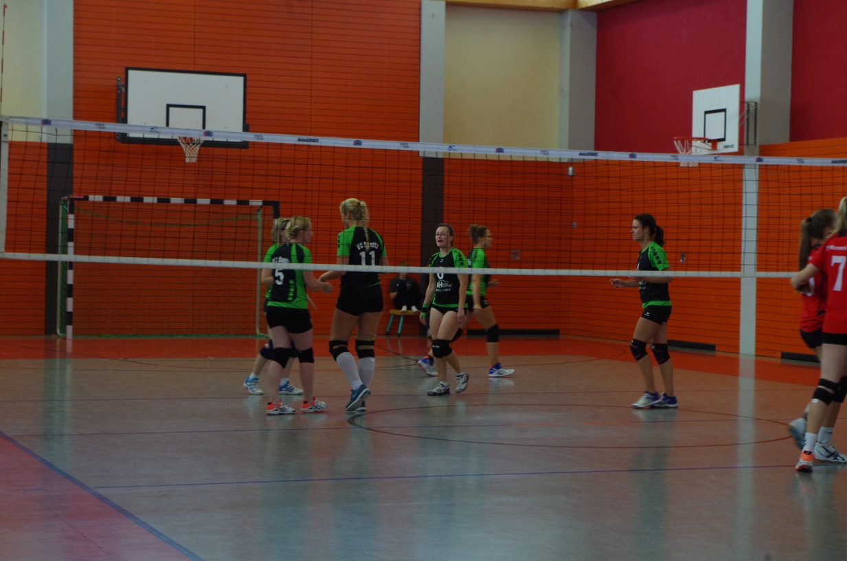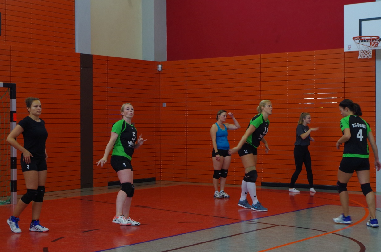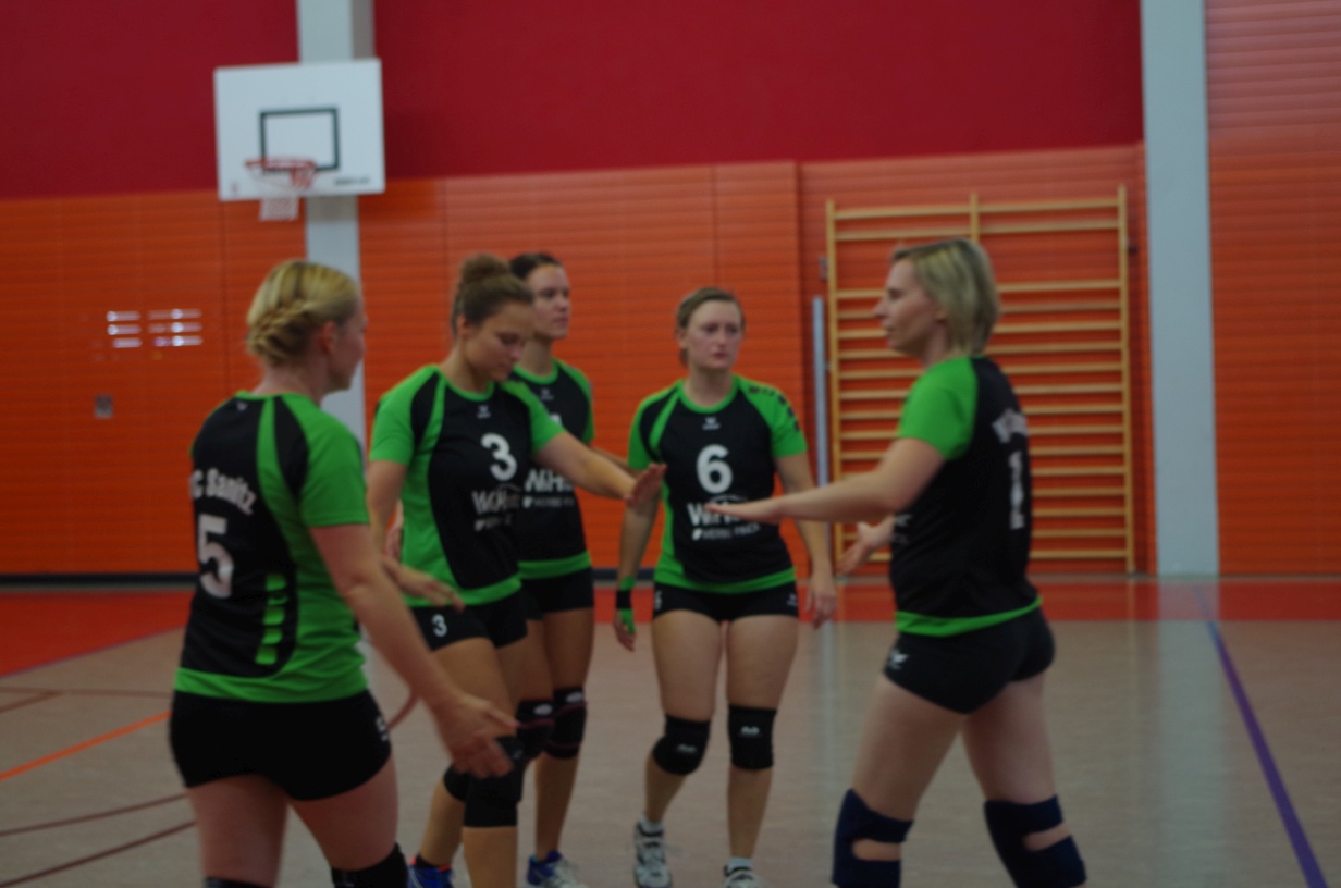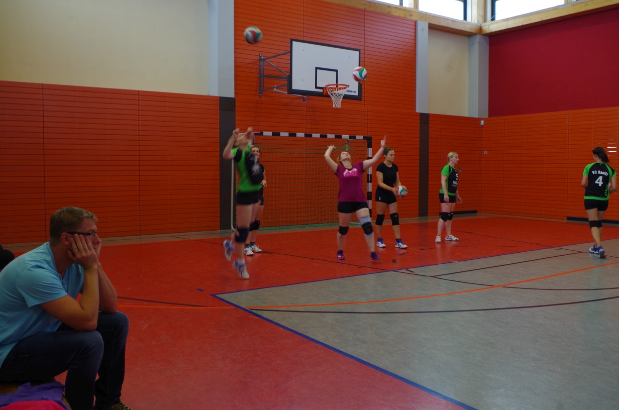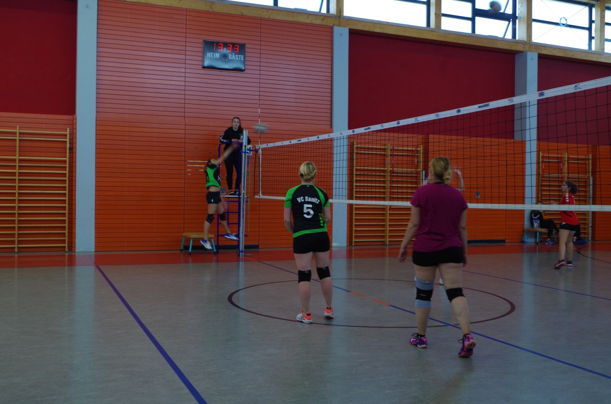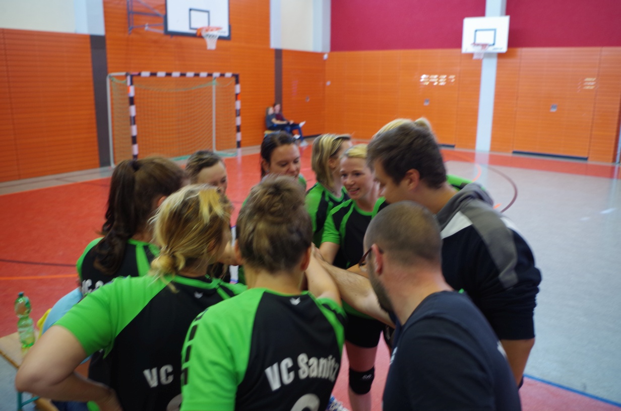 Wir waren erstaunt, wie flink sie waren. Dagegen sahen wir so manches Mal ganz schön alt aus (im wahrsten Sinne des Wortes, denn wir sind überwiegend doppelt so alt). Doch wollten wir zumindest mit unseren bereits gewonnenen Erfahrungen punkten und gewannen die ersten beiden Sätze mit 25:13, bzw. 25:14. Allerdings wären wir nicht der VC Sanitz, wenn nicht nach einem Hoch ein Tief folgen würde. Zum Ende des dritten Satzes wollten die Annahmen nicht mehr klappen und die Stralsunder Mädels kamen mit ihren Punkten immer näher. Zum Glück konnten wir eine Niederlage gerade so abwenden und verabschiedeten die Gastgeber mit einem 25:22.