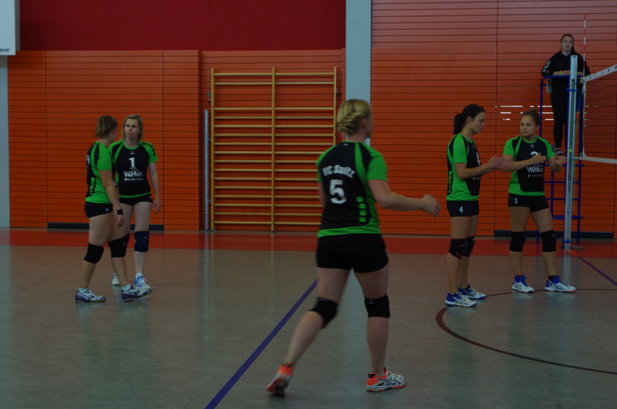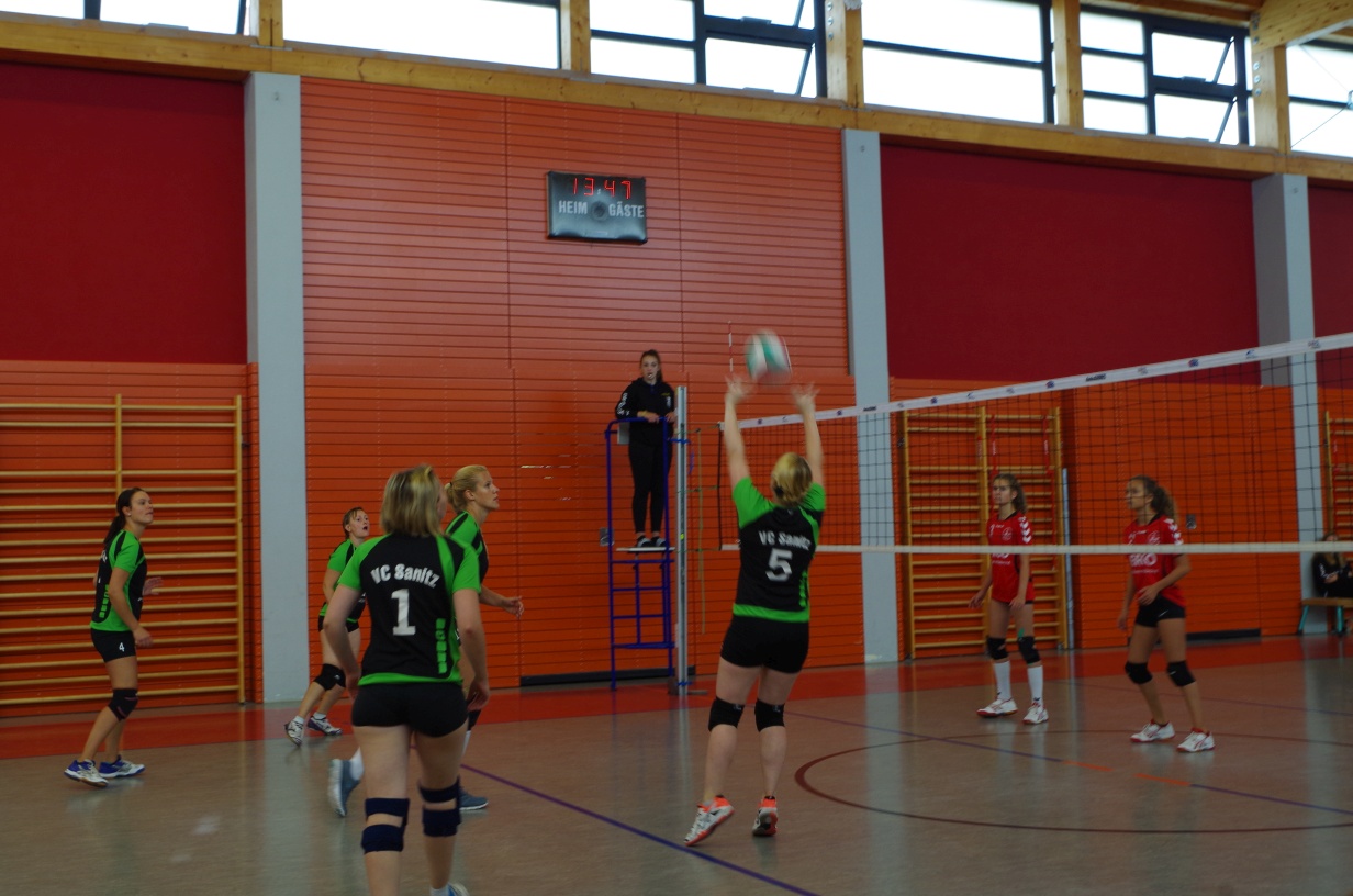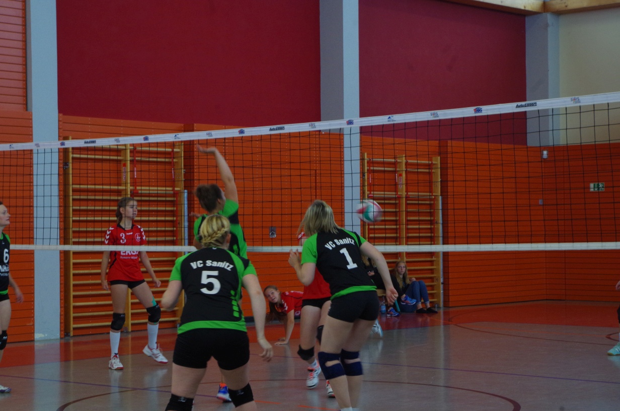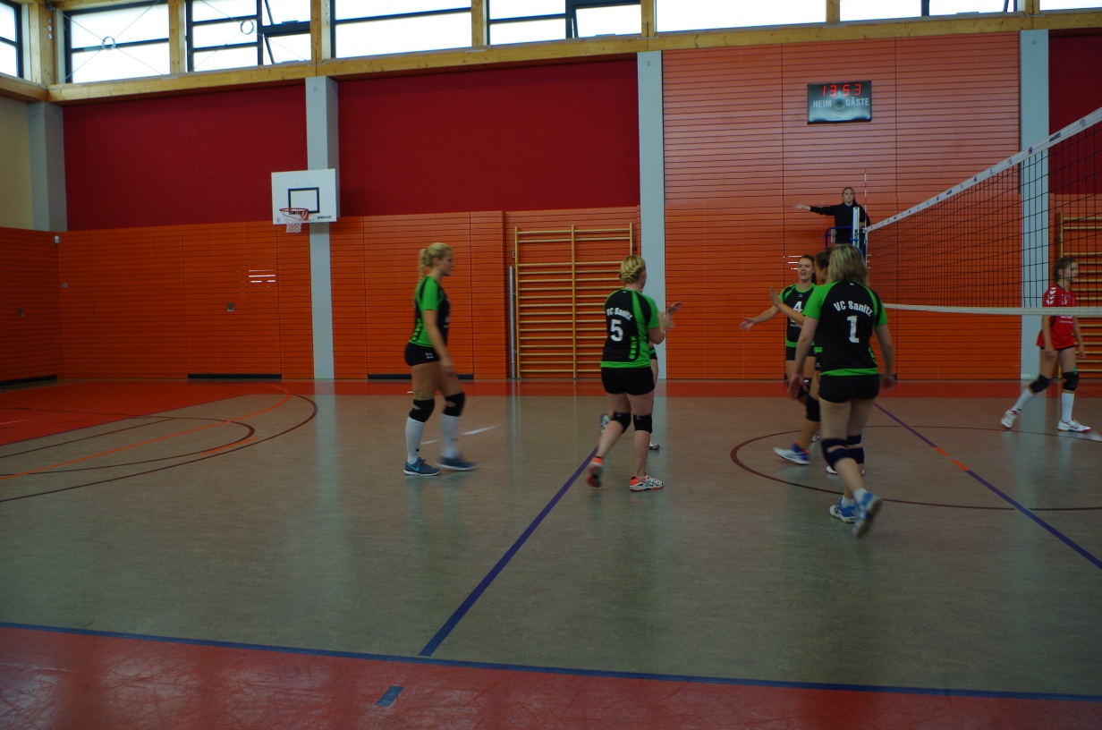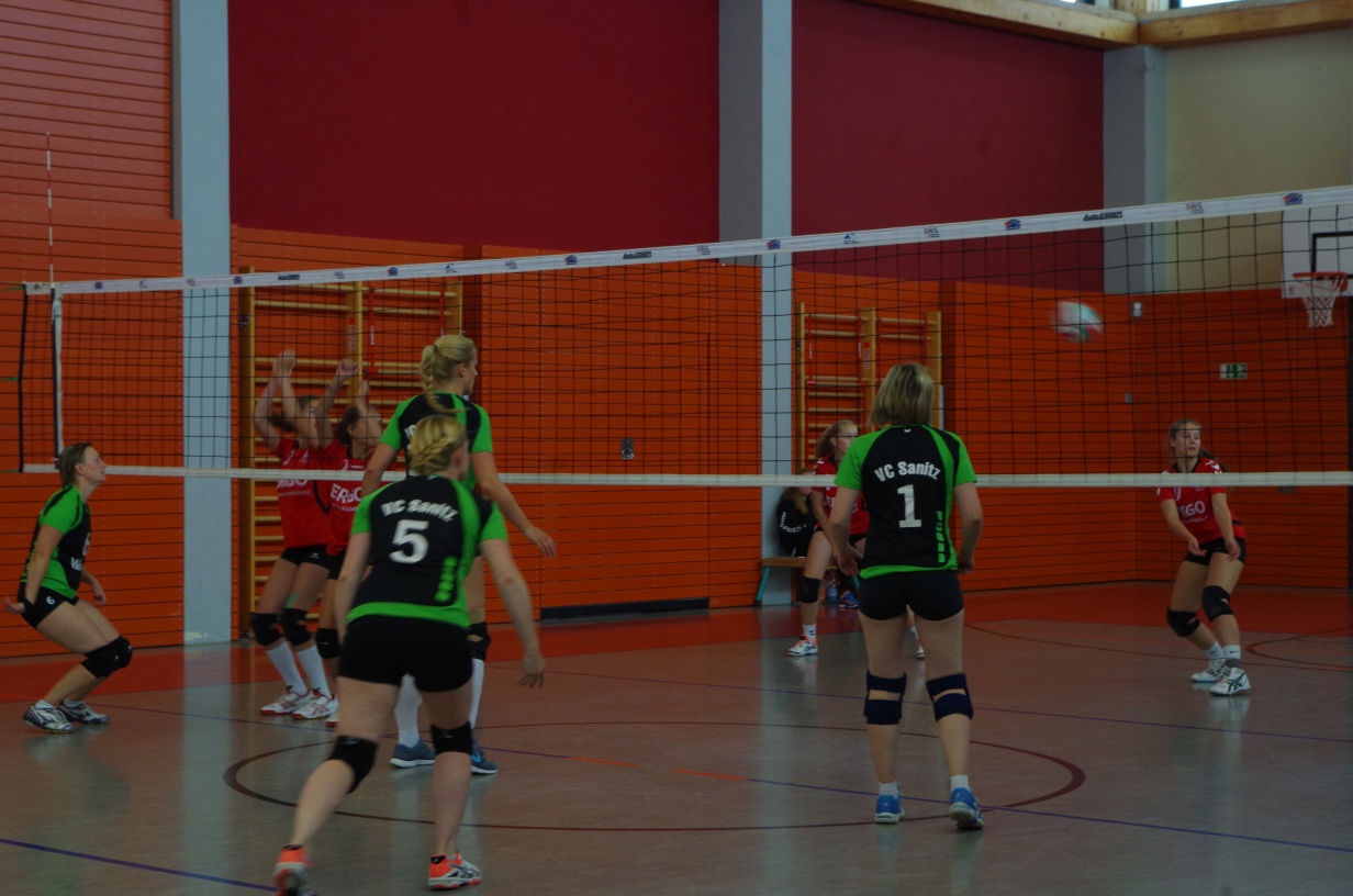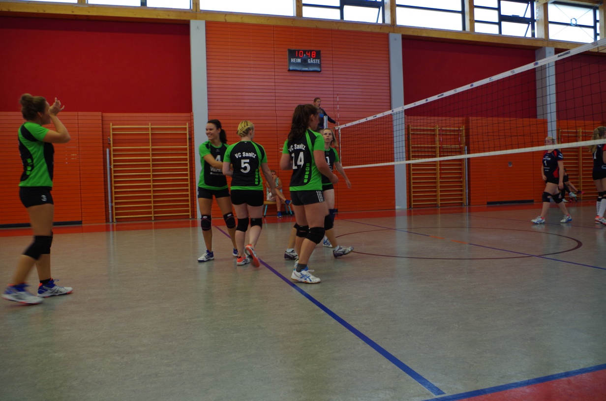 Wir waren erstaunt, wie flink sie waren. Dagegen sahen wir so manches Mal ganz schön alt aus (im wahrsten Sinne des Wortes, denn wir sind überwiegend doppelt so alt). Doch wollten wir zumindest mit unseren bereits gewonnenen Erfahrungen punkten und gewannen die ersten beiden Sätze mit 25:13, bzw. 25:14. Allerdings wären wir nicht der VC Sanitz, wenn nicht nach einem Hoch ein Tief folgen würde. Zum Ende des dritten Satzes wollten die Annahmen nicht mehr klappen und die Stralsunder Mädels kamen mit ihren Punkten immer näher. Zum Glück konnten wir eine Niederlage gerade so abwenden und verabschiedeten die Gastgeber mit einem 25:22.