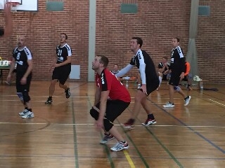 Im zweiten Spiel ging es nun gegen den Gastgeber. Auch ohne Wechselspieler und einem Altersdurchschnitt von fast 40 Jahren, war der Tabellendritte der letzten Saison ein starker Gegner. Anders als wir ist Grün-Weiß Wismar, technisch top ausgebildet, gut eingespielt und überzeugt mit einer geschlossenen Mannschaftsleistung. Wir waren in allen Belangen unterlegen. Besonders schwer taten wir uns mit ihren druckvollen, aber trotzdem sicheren Aufschlägen. Bei uns war „der Wurm drin“ und die Auswechslungen brachten eher Verunsicherungen als Entlastungen. Einzig der zweite Satz konnte mit 27 zu 25 gewonnen werden, die Sätze eins, drei und vier verloren wir deutlich.